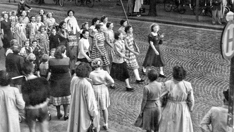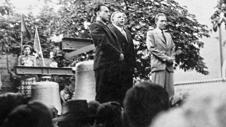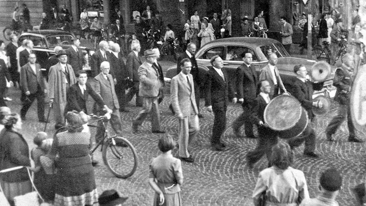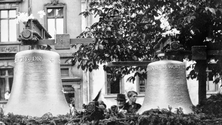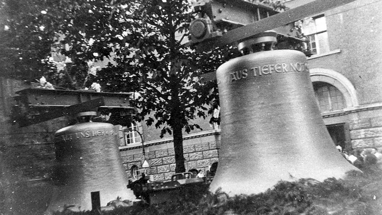 Mit einem Festzug, angeführt vom Posaunenchor, wurden die beiden neuen Glocken von den beiden Gemeinden der Lutherkirche am Offenbacher Güterbahnhof (heute Ost-Bahnhof) abgeholt.