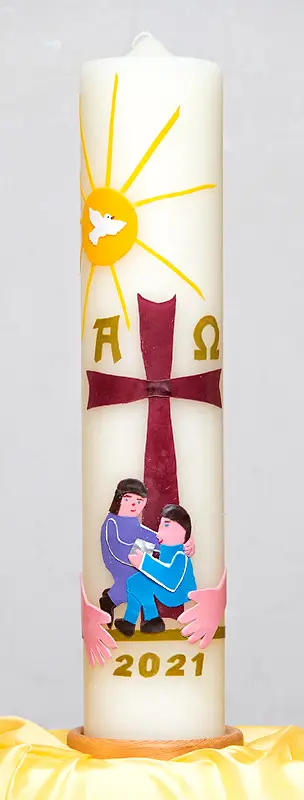 So lautet die Jahreslosung für 2021. Sie stammt aus der sogenannten Feldrede im Lukasevangelium. Dort mahnt Jesus auch Werte wie Zuwendung und Solidarität, Nächstenliebe und Feindesliebe an. Die Osterkerze versucht diese Worte der Jahreslosung bildlich darzustellen.